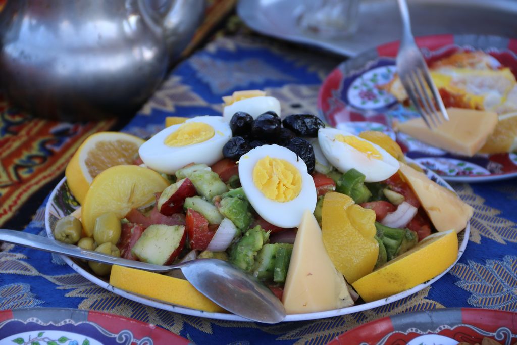 Unsere tägliche Wanderung, im gemächlichen Tempo zusammen mit den Chameliers und den Dromedaren, startet im Allgemeinen zwischen 8 und 9 Uhr und dauert am Vormittag etwa 3 bis 4 Stunden. Nach einer ausgiebigen Mittagspause wandern wir weitere ein bis zwei Stunden. Die Mahlzeiten sind reichhaltig, abwechslungsreich und frisch zubereitet. Es stehen verschiedene Getränke zur Verfügung, Mineralwasser kann jederzeit nachgefüllt werden. Wenn genügend Feuerholz vorhanden ist, wird am Abend das traditionelle Fladenbrot in der Glut gebacken.